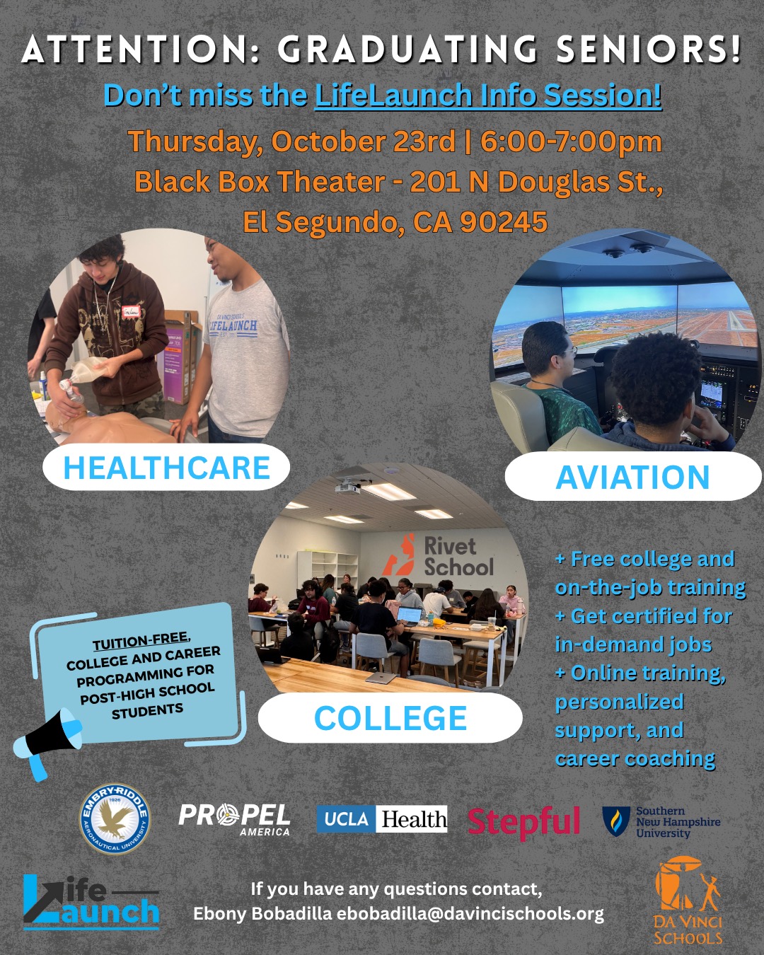We invite you to join us for the upcoming LifeLaunch Information Session on Thursday, October 23rd from 6:00–7:00 PM at the Black Box Theater (201 N Douglas St, El Segundo, CA 90245).
