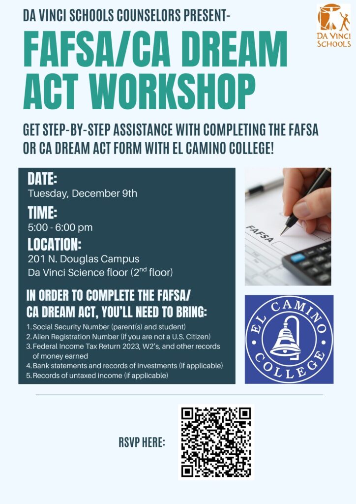 Da Vinci Schools is hosting a hands on FAFSA/Dream Act workshop on our campus, where an El Camino College financial aid rep will be here to answer your financial aid/FAFSA/CA Dream Act questions, help you fill out the applications, and submit that night! This is taking place on the DV Science floor on Tuesday December 9th, 5:00 p.m.-6:00 p.m. Please RSVP HERE so we know how many computers will be needed.