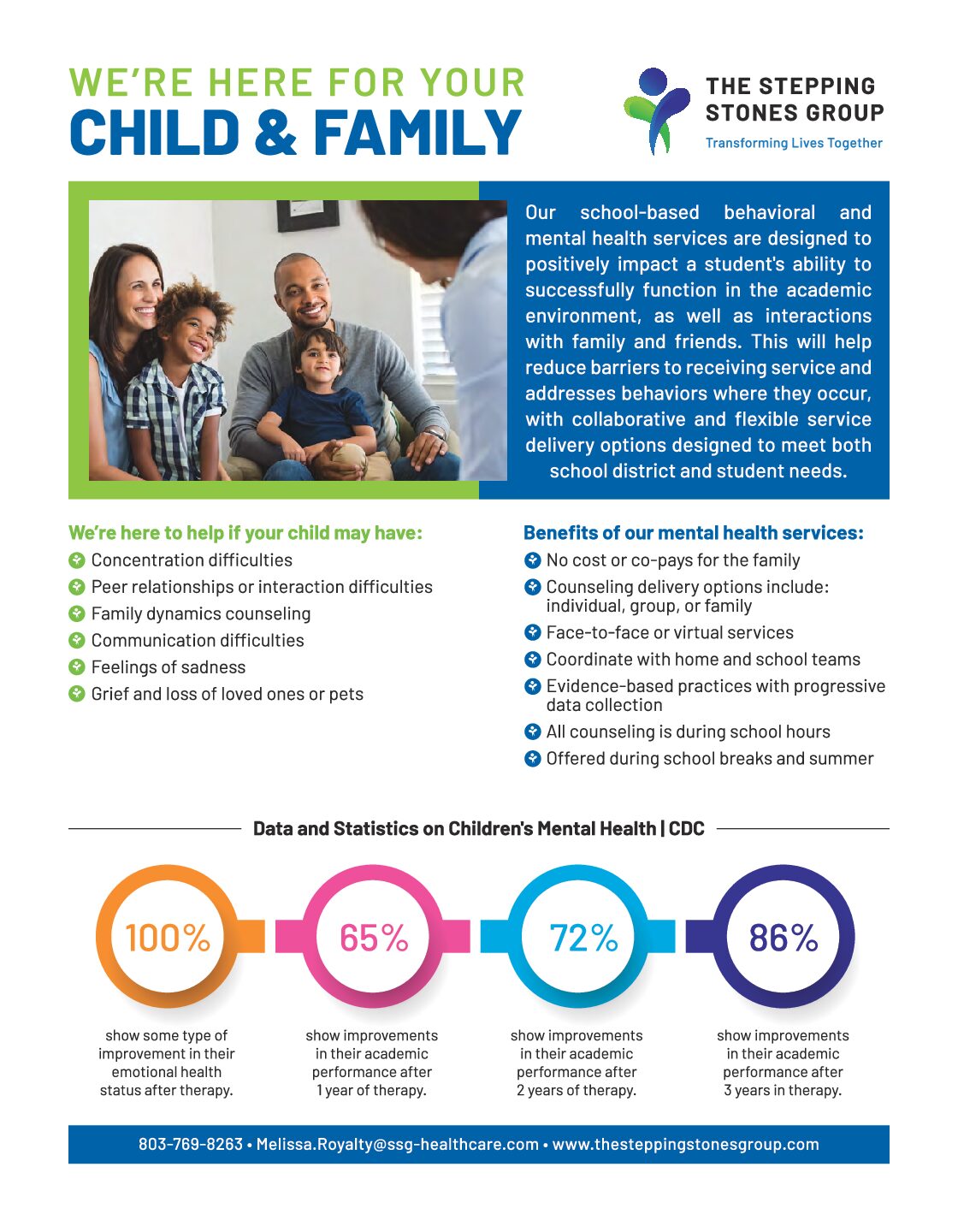 DV Schools and Connect High School are pleased to partner with Stepping Stones, a school-based therapy provider, to offer free counseling and mental health support services to our students and families at no cost to you.