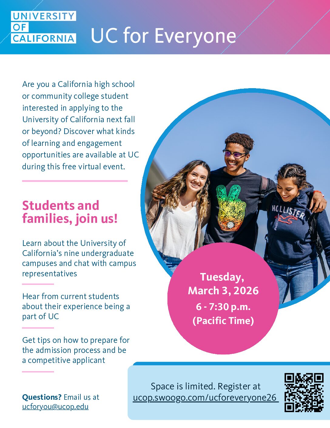 By Erin Knott|2026-02-17T15:13:02-08:00February 17th, 2026|Uncategorized|Comments Off on UC for Everyone! A FREE University of California event for 9th-11th graders and families!
